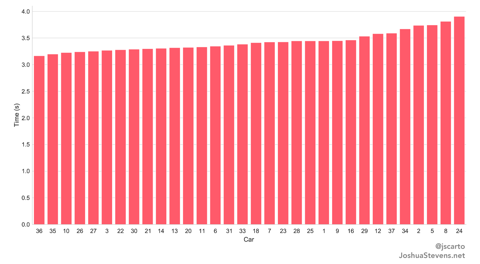 Notice anything in the plot above? While most dens are associated with a large range of times, the Wolves demonstrate a much tighter grouping without any outliers. All of their cars, across all heats, performed remarkably alike.