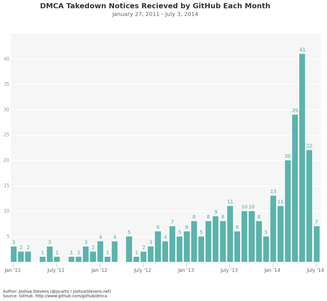 In addition to encouraging readers to put away the pitchforks, I hope this also prompts a closer look at DMCA requests and the growth of GitHub. With the GitHub API it becomes possible to do tons of really interesting analyses of code (others already have done some fantastic work with it).